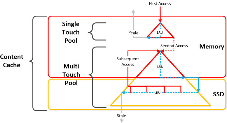 • 記述:Content Cache?(即ち、弾性重複排除エンジン(Elastic Dedupe Engine))は、CVMのメモリとSSDに跨って存在する重複排除が可能なリード キャッシュである。キャッシュ内に存在してないデータに対するread requestが発生すると(或いは、特定のfingerprint?に基づいて)、データはContent Cache?のシングル・タッチ プール内に配置される。このContent Cache?は、キャッシュから排除されるまでLRUを使用するメモリー内に完全に存在している。 それに続くread requestは(実施のデータは全く動かないか、単にmetadataをキャッシュしているだけ)、データをメモリーとSSDにより構成されているマルチ・タッチ プールのメモリ部分に移動する。この時点より2組のLRUサイクルが存在し、一つは新しいLRUカウンターに立退き処理が割付けられておりマルチ・タッチ プール(multitouch pool)のSSDセクションへデータを移動するメモリー内の部分(in-memory piece)である。マルチ・タッチ プール内のデータへのread requestは全て、データがそれが新しいLRUカウンターを与えられるマルチ・タッチ プールの頂上への移動を発生させるであろう。 コンテナー レベルでのfingerprint処理(指紋処理)は、UIを経由して構成される。 defaultでは,fingerprintingは利用を停止されている。