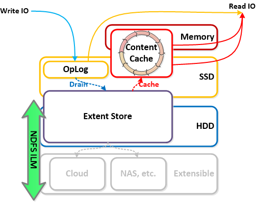 • 記述:Extent Cache?は、完全にCVMのメモリ内に置かれた in-memory read cacheである。 これは、fingerprint処理と重複排除処理機能の利用が停止されているコンテナのためにfingerprintの付いていないExtent?の保存を行う。 V3.5の時点で、これはContent Cache?から分離されたが、以後のバージョンで統一されるであろう。
