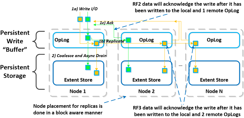 Nutanix Platformは、現在、resiliency factor 即ち replicaton factor(RF)とchecksumを 用いて、node,diskの故障や機能低下が発生した場合にdataの冗長性と有効性を保障している。 上記に述べた通り、OpLogは、低遅延のSSD tierへの書込み発生を吸収するための処理の段階と なる。 hostへの書込みに成功した事を知らせるacknowledge(ack)が発行される前に、 ローカルなOpLogに書込まれる時に、dataは同期的にRFの値に依って他の1つ或いは2つのCVMOpLogに 複製される。