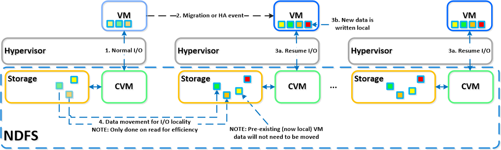 Nutanixノードのグループは、Nutanix Distributed Filesystem(NDFS)と呼ばれる分散プラットフォームを構成する。 NDFSは、hypervisorからは、集中化されたストレージ・アレイの様に見える。 然しながらI/Oの全ては最高性能を提供するためにローカルに処理されている。 分散システムをこれらのノードがどの様に構成しているのかと云うことのより詳細は、以下の見出される。