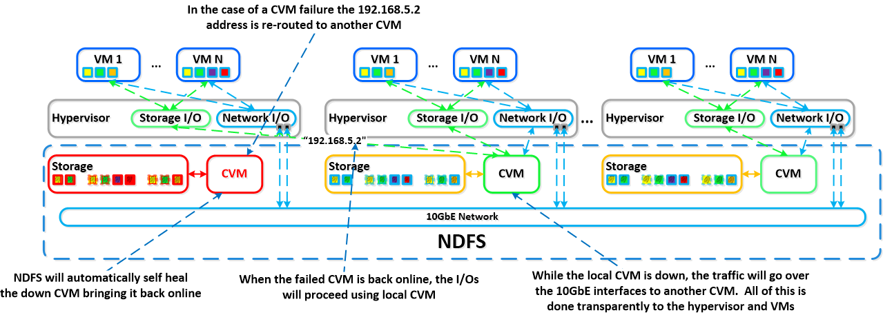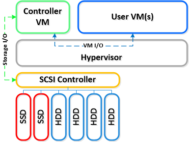 各ノードは、業界標準のハイパーバイザー(現時点でESXi?, KVM?, Hyper-V?)とNutanix VM(CVM)を実行している。 Nutanix CVMは、Nutanixソフトウェアを実行し、hypervisorとホスト上で実行される全てのVMのためのI/Oオペレーションの全てを取り扱う。*1 VMware vSphereを実行しているNutanixユニットにとって、SSDとHDDデバイスを管理しているSCSIコントローラは、直接にVM-Direct Path(Intel VT-d)を利用しているCVM?へ直接渡される。Hyper-V?の場合、ストレージデバイスはCVMへ通過する。