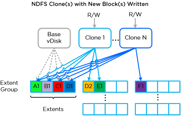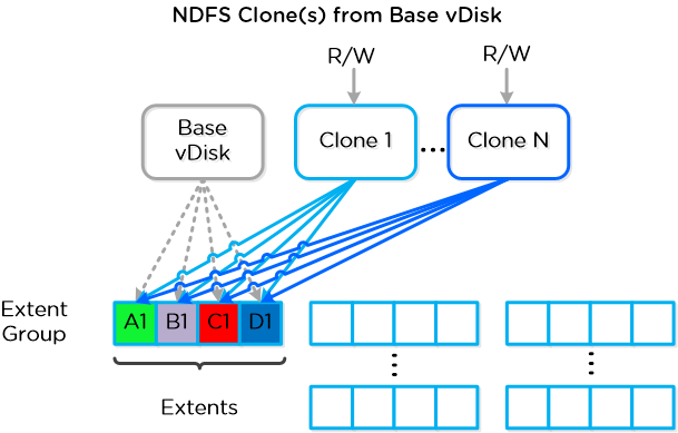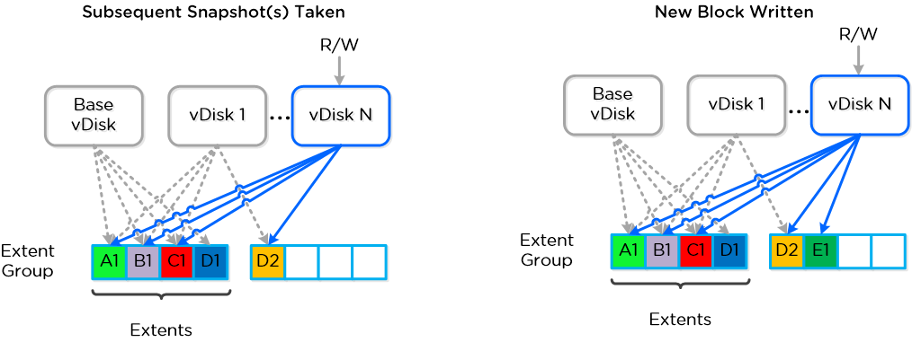 スナップショット或いはクローンが作成される時、ベースとなるvDiskは変更不可(immutable)なものとしてマークされ、もう一方のvDiskがread/write可能なものとして作成される。 この時点で、両方のvDiskは同じblock map、即ち該当しているextentsへのvDiskのmetadataマッピングを持っている。読込み遅延を発生し得るスナップショット チェーンを辿る必要の有る伝統的なアプローチと異なり、各vDiskはそれ自身のblock mapを持っている。これにより、スナップショット チェーンが非常に深い場合に通常認められるオーバーヘッドを排除することができ、ユーザーが如何なるパーフォーマンス上の影響を受ける事無く連続にスナップショットを作成することが可能となる。
