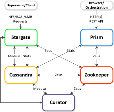 • 説明:ストレージは、データ管理とI/Oオペレーションの全てを担当しており、hypervisor(NFS?,iSCSI?,又はSMBを経由して)からの主なインターフェースである。 このサービスは、ローカル化されたI/Oを処理するためにクラスター内の各ノード上で実行される。