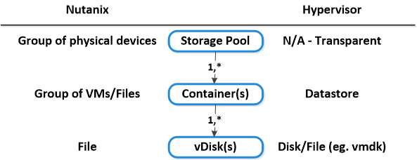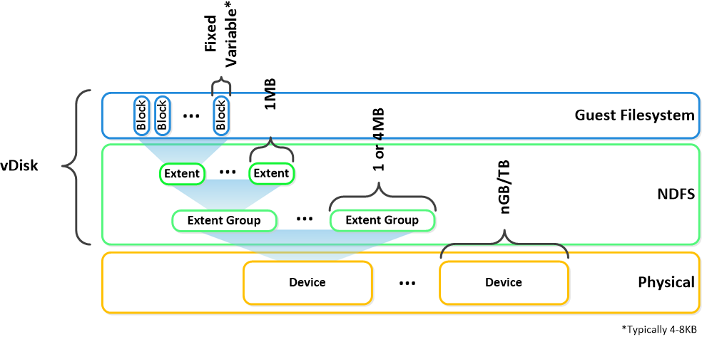 • 記述:vDiskは、vmdkとVMハードディスクを含んだNDFS上で512KBを上回る全てのファイルである。 vDiskは、グループ化されExtent Groupとしてディスク上に保存されたExtentにより構成されている。